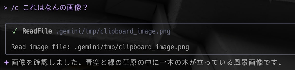 /c, Gemini automatically reads.gemini/tmp/clipboard_image.pngusing theread_filetool and mentions the contents of the image. -