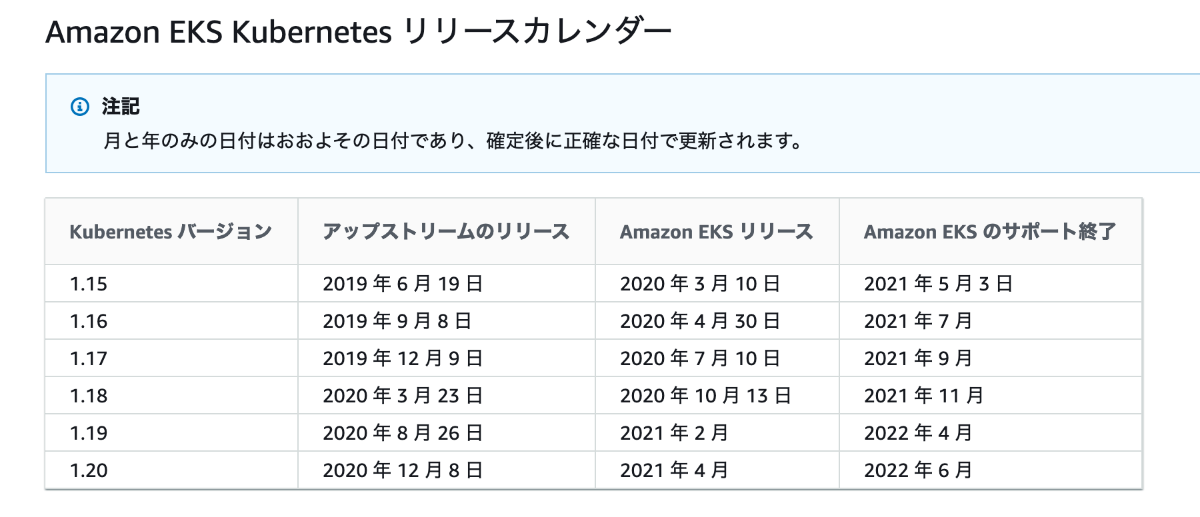 Amazon EKS Kubernetes バージョン を見る限り、EKSは約3~4ヶ月に1度バージョンアップデートがあり、それに追従していく必要があります。