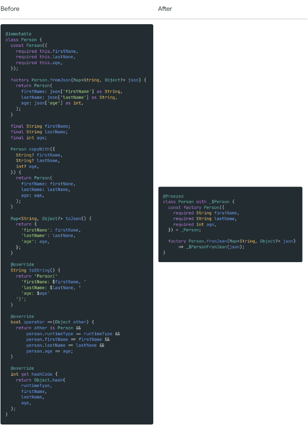 下記の画像がイメージしやすく、左が普通に定義、右が freezed を使用して定義した例です。