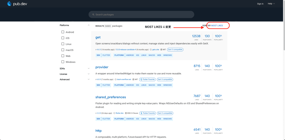 全部を網羅することは不可能ですが、pub.dev 内を空文字で検索し、並び替えを MOST LIKES に変更して上から見ていくと、よく使われている便利なパッケージがたくさん見つかって勉強になります。
