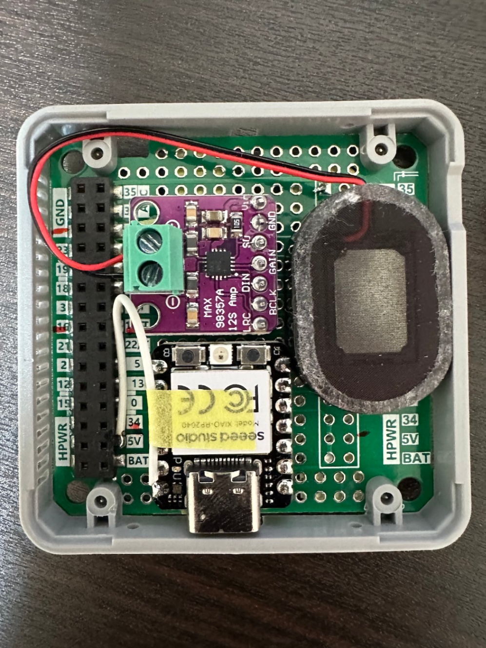 MAX98357Aのブレークアウト基板(I2Sアンプ)にピンヘッダを取り付けて、BUS module上に実装するよ。スピーカー用の端子は取り外したいなら取り付けて、取り外し不要なら直接はんだ付けしてもいいよ。