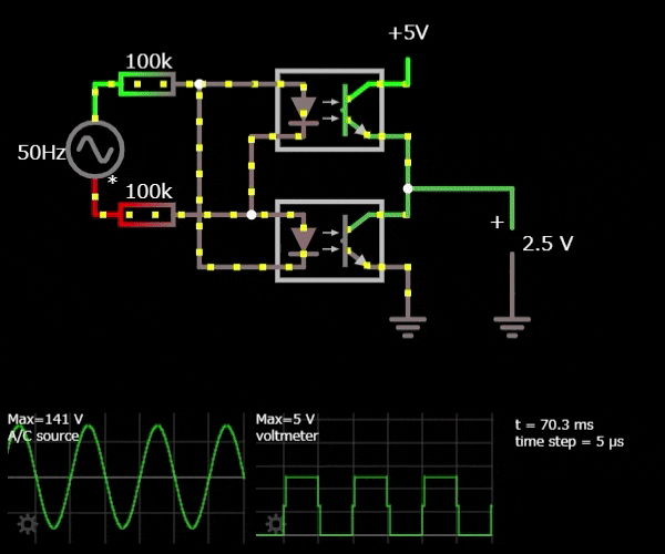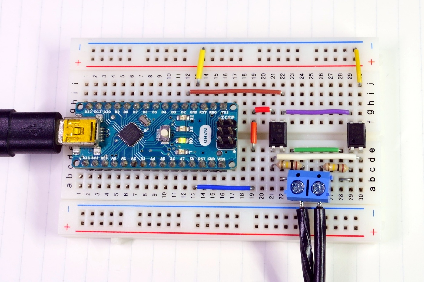交流をそのまま Arduino に入力はできません。今回はフォトカプラを使って電源を分離、Arduino に入力できる信号に加工します。周波数さえ測定できればよいので Arduino に入力される信号は矩形波になります。