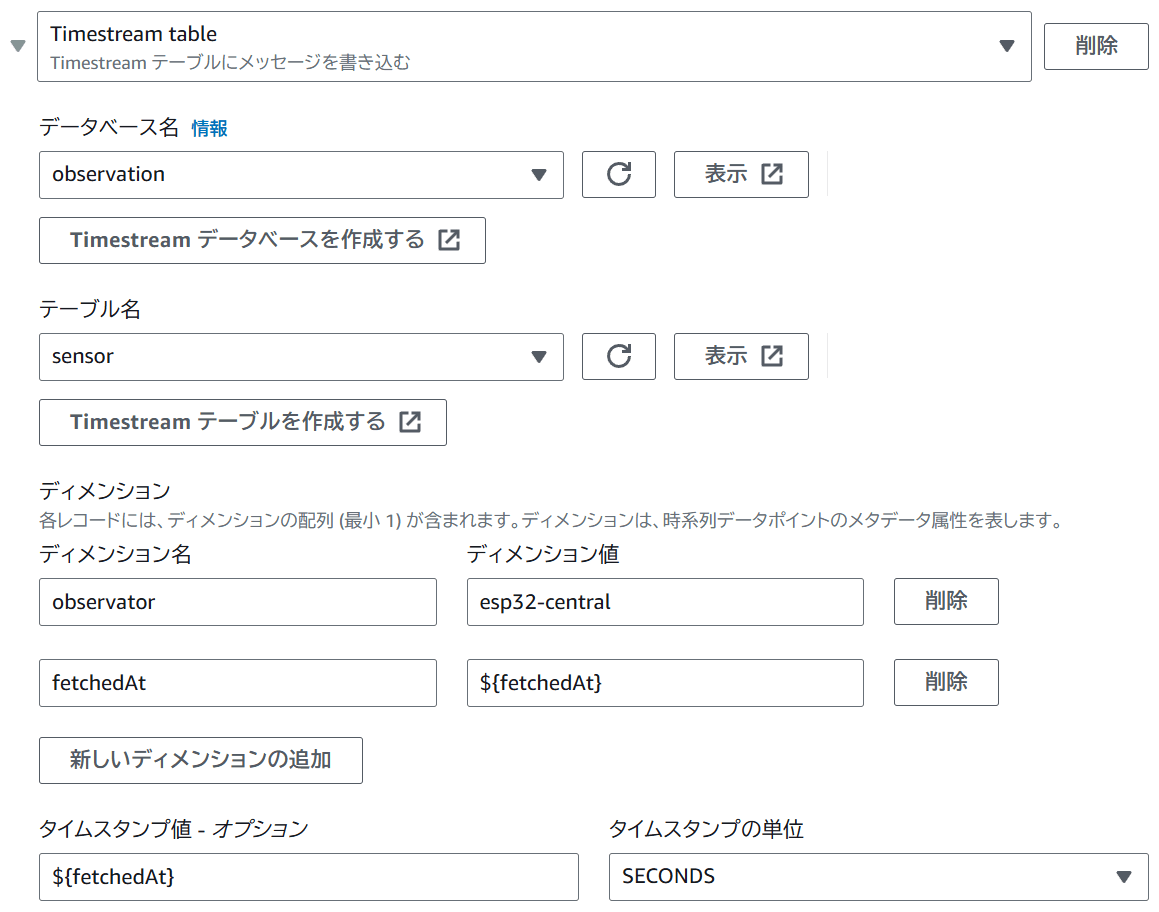 AWS IoT Core > メッセージのルーティング > ルール > ルールを作成 で次のようなSQLステートメントとルートアクションを設定します。ここで、MQTTトピックは observation/home/esp32-central/sensors、Timestream のディメンションとして observator と fetchedAt を指定します。ルートアクションにて、オプション扱いになっているタイムスタンプは fetchedAt を指定します。