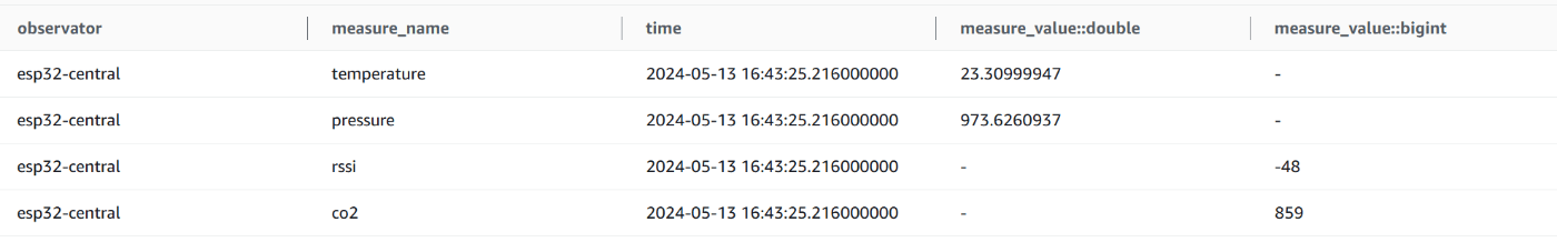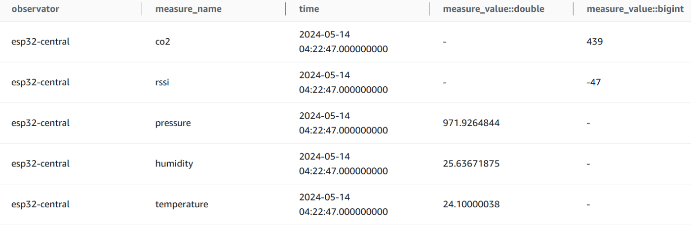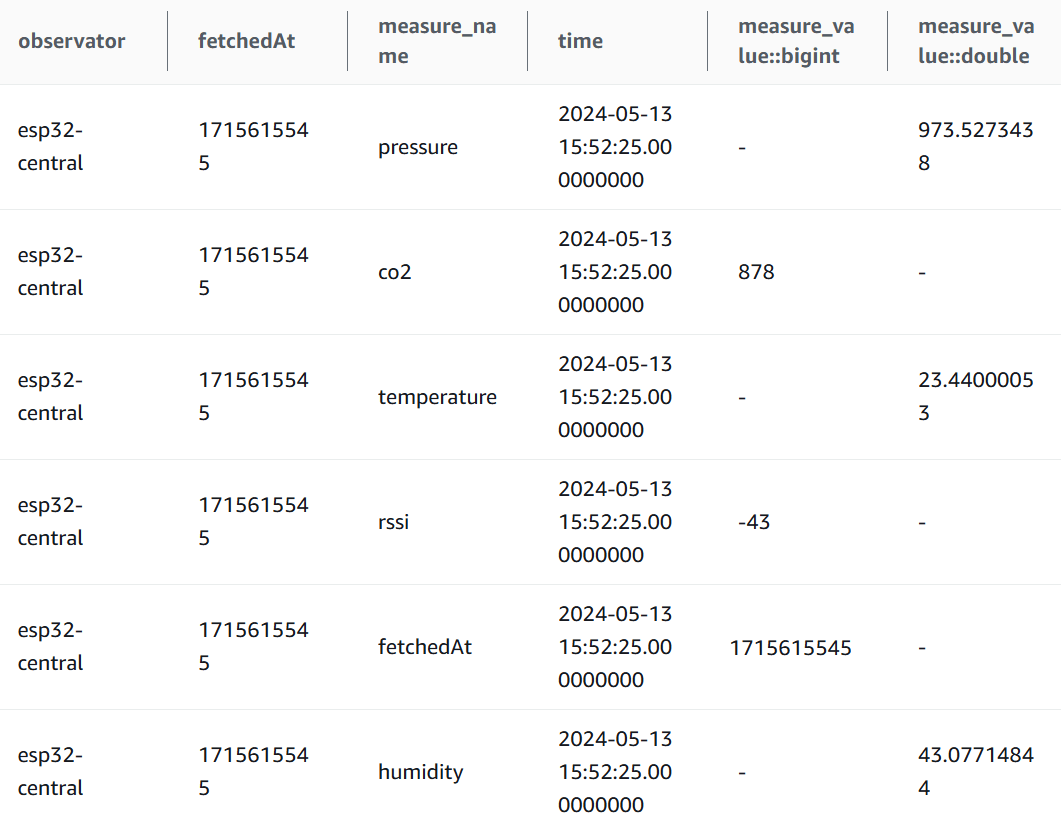 MQTTトピックが発行され、センサデータが IoT Core → Lambda → Timestream と連携し、以下のようにレコードが挿入されます。