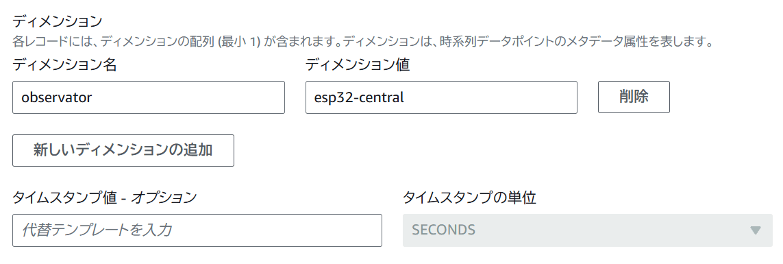 AWS IoT Core から Timestream へ直接的にレコードを挿入するのではなく、Lambda を介してレコードを挿入するしかありません。現状、AWSマネジメントコンソール上ではディメンションの指定なしでタイムスタンプを指定することができません。
