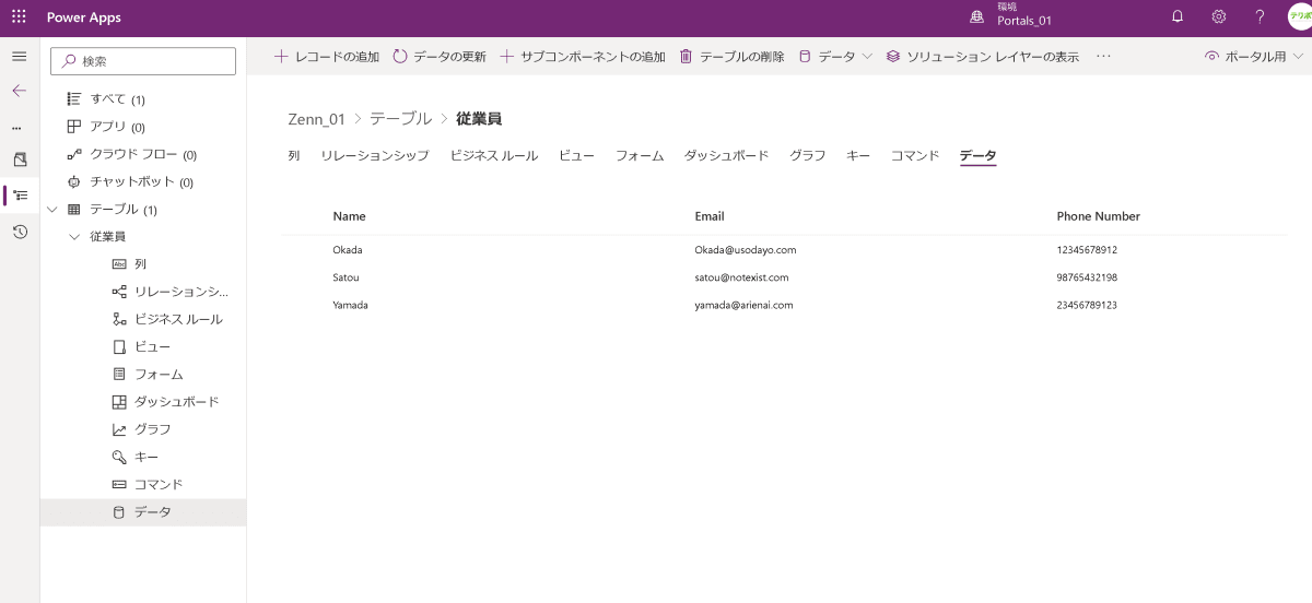 特になにも変わっていないように見えますが、Dataverse テーブルからデータを取得しています。