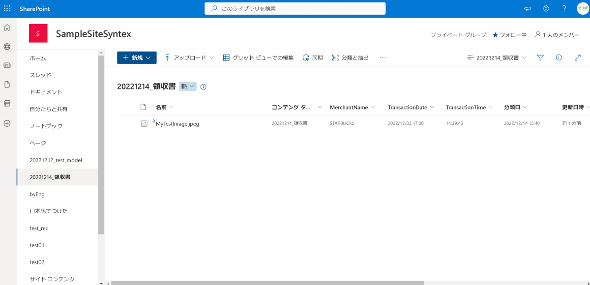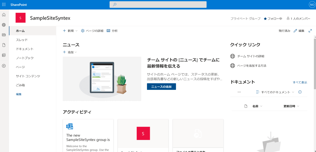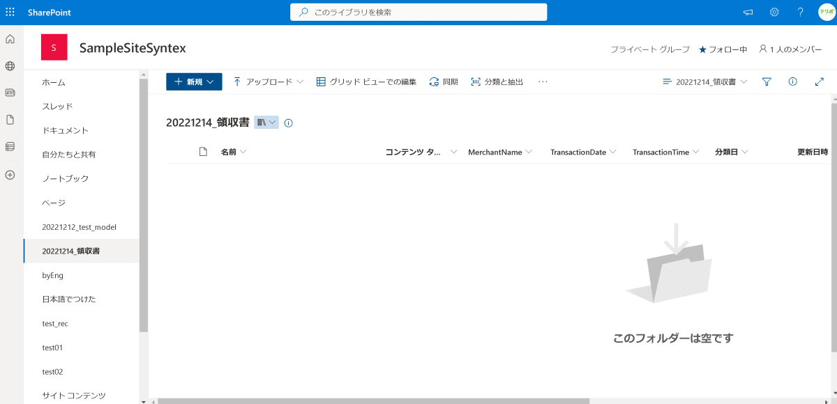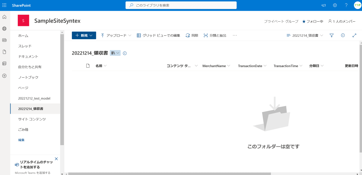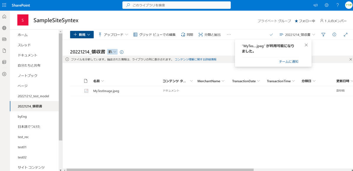 - それから、実際に解析させるファイルをアップロードする SharePoint サイトを作成します。