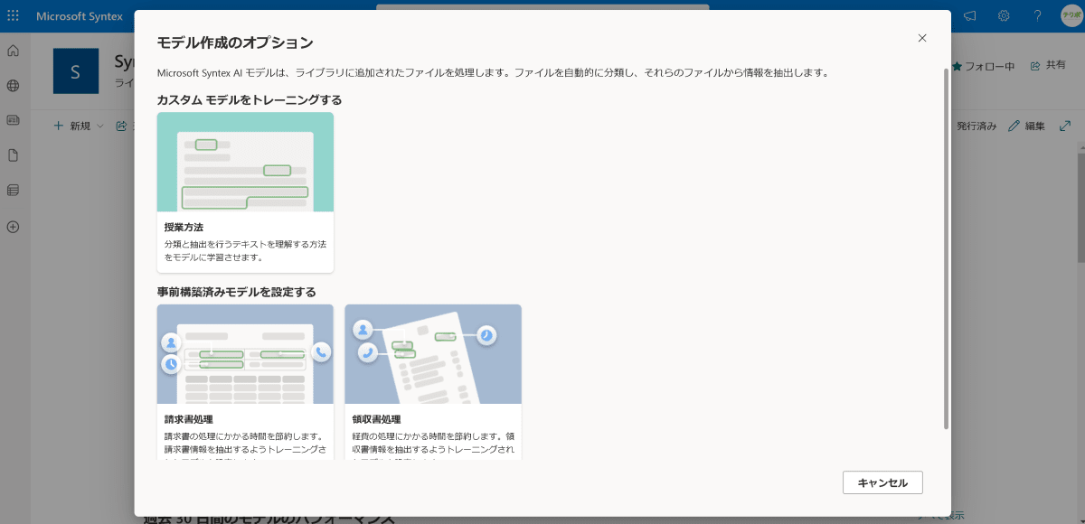 以下の画面から、 Microsoft Syntex でコンテンツ AI を使用するを選択します。