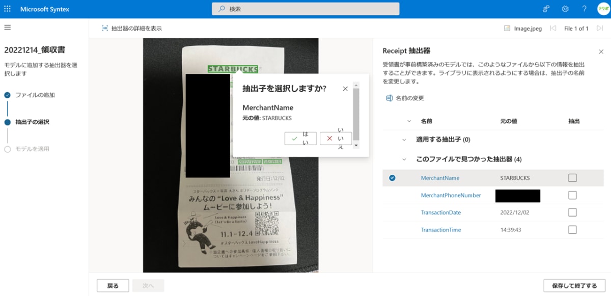 以下のように、アップロードしたファイルから extractor entity (抽出器)という形で、店名や時間などを取得してくれますので、ライブラリのプロパティに取り込みたいものだけチェックし、次へを選択します。