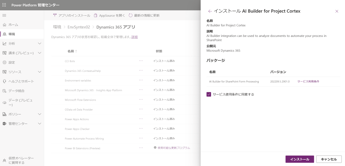 作成できたら、Dynamics 365 アプリから、AI Builder for Project Cortex をインストールします。