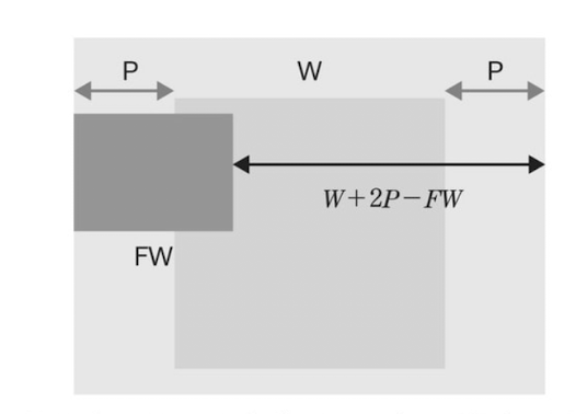 があるため、フィルタの左端が動ける全範囲は(W + 2P - FW)