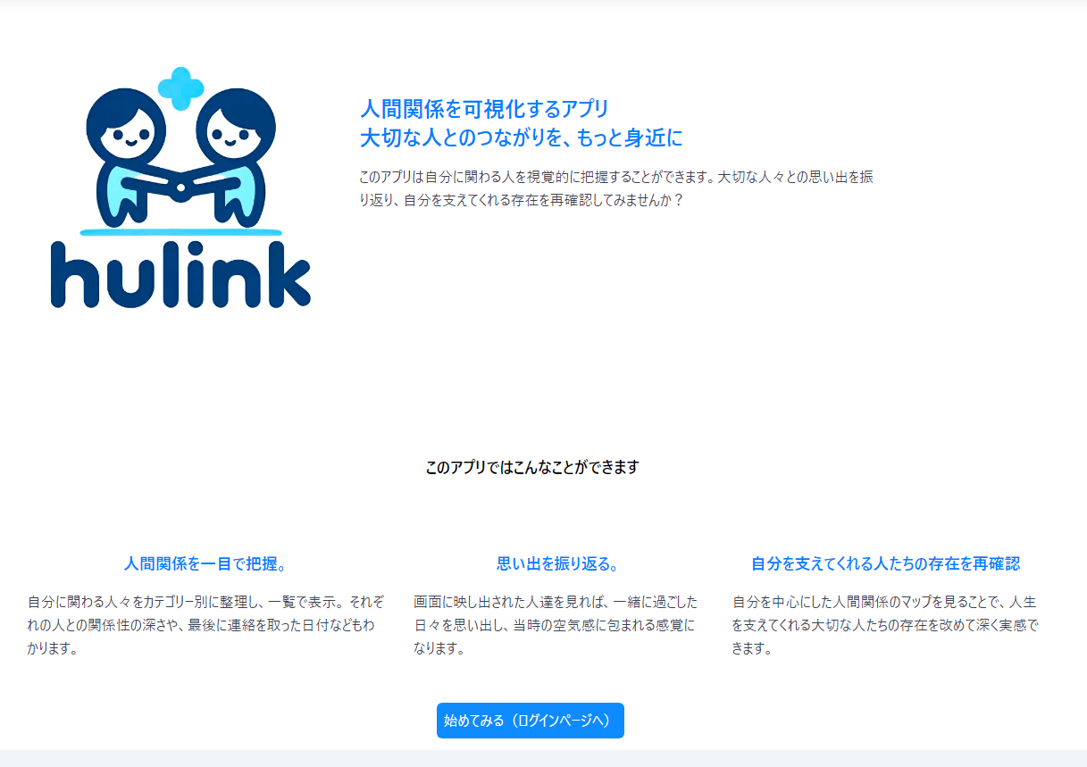 今回作ったHuLink(ヒュリンク)はユーザが関わった人を入力して、その人たちをマインドマップのようなグラフで見られるアプリとなっています.
