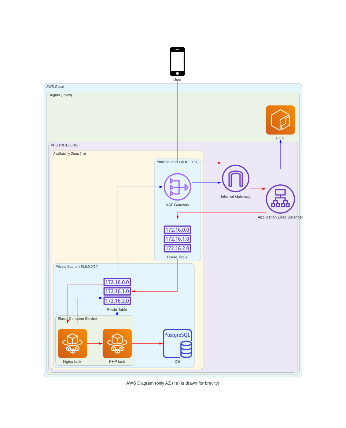 赤矢印がユーザによるリクエストの流れ、青矢印がそれ以外(AWSサービスからの通信など)を表す(青はレスポンスの流れではない)。