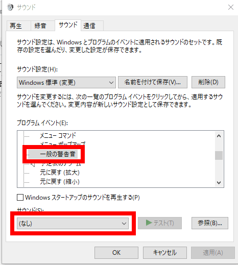 「一般的な警告」のサウンドをOFFにします。
