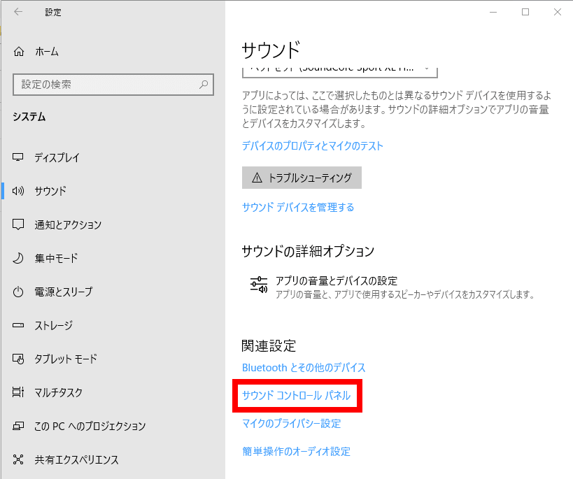 設定からサウンドを選択し、サウンドコントロールパネルを開きます。