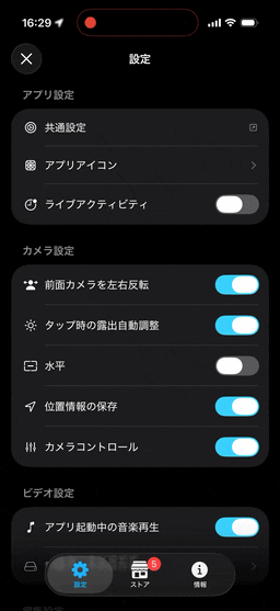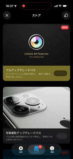 設定画面は、カメラや編集機能の設定変更を行ったり、アプリ内課金アイテムを購入するための画面です。