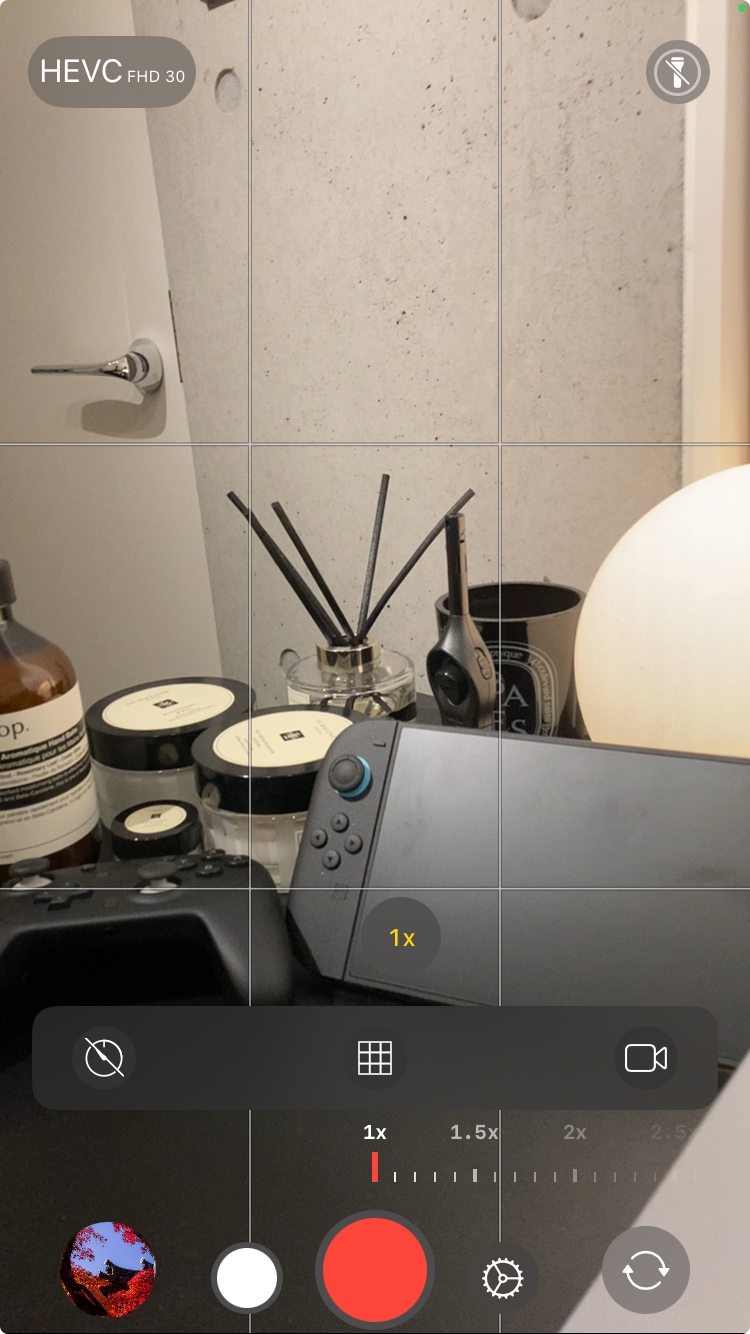 ビデオ撮影モードの画面。iPhoneの標準的なビデオ比率は9:16。横幅いっぱいにプレビューを表示すると、画面の8割近くをプレビューが占有する。