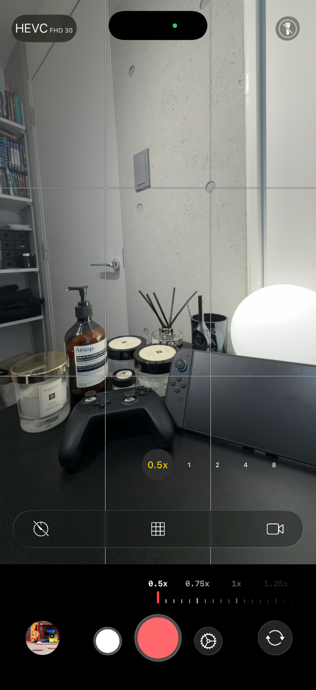 ビデオ撮影モードの画面。iPhone SE(第2世代)では、UI コンポーネントをプレビュー上に重ねて配置せざるを得ないレイアウトになる。App Store に並ぶカメラアプリを見ても、iPhone SE 2 のレイアウトが崩壊しているものが多い。