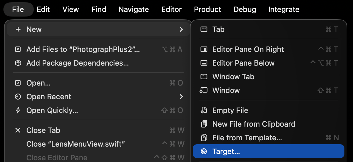 コントロールウィジェットを追加したいアプリのXcodeプロジェクトを開き、[File] > [New] > [Target]の順に選択します。