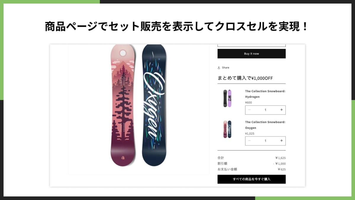 ひとつ上で紹介したアプリでは、単品商品の商品ページ内でセット販売(クロスセル)を実現していますが、こちらのアプリではセット商品という架空の商品に対して、アプリから単品の商品をいくつか紐づけることでセット販売(クロスセル)を実現しています。これにより商品ページだけでなく、トップページやコレクションページでセット購入を促すことができるため、より多くの売り上げを期待できるはずです。