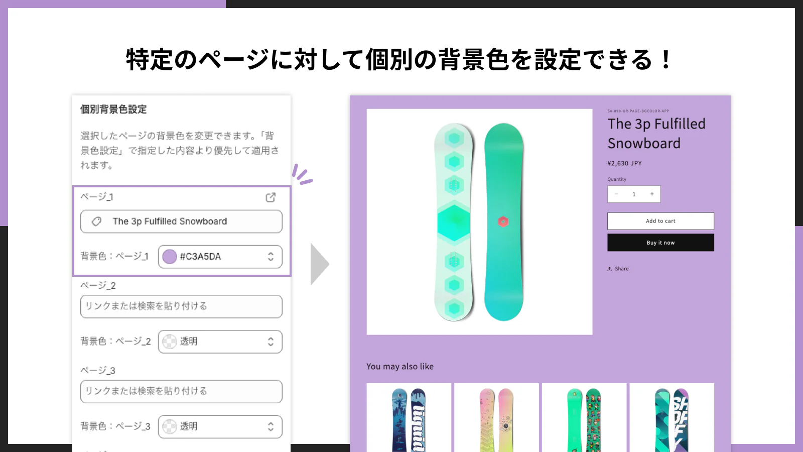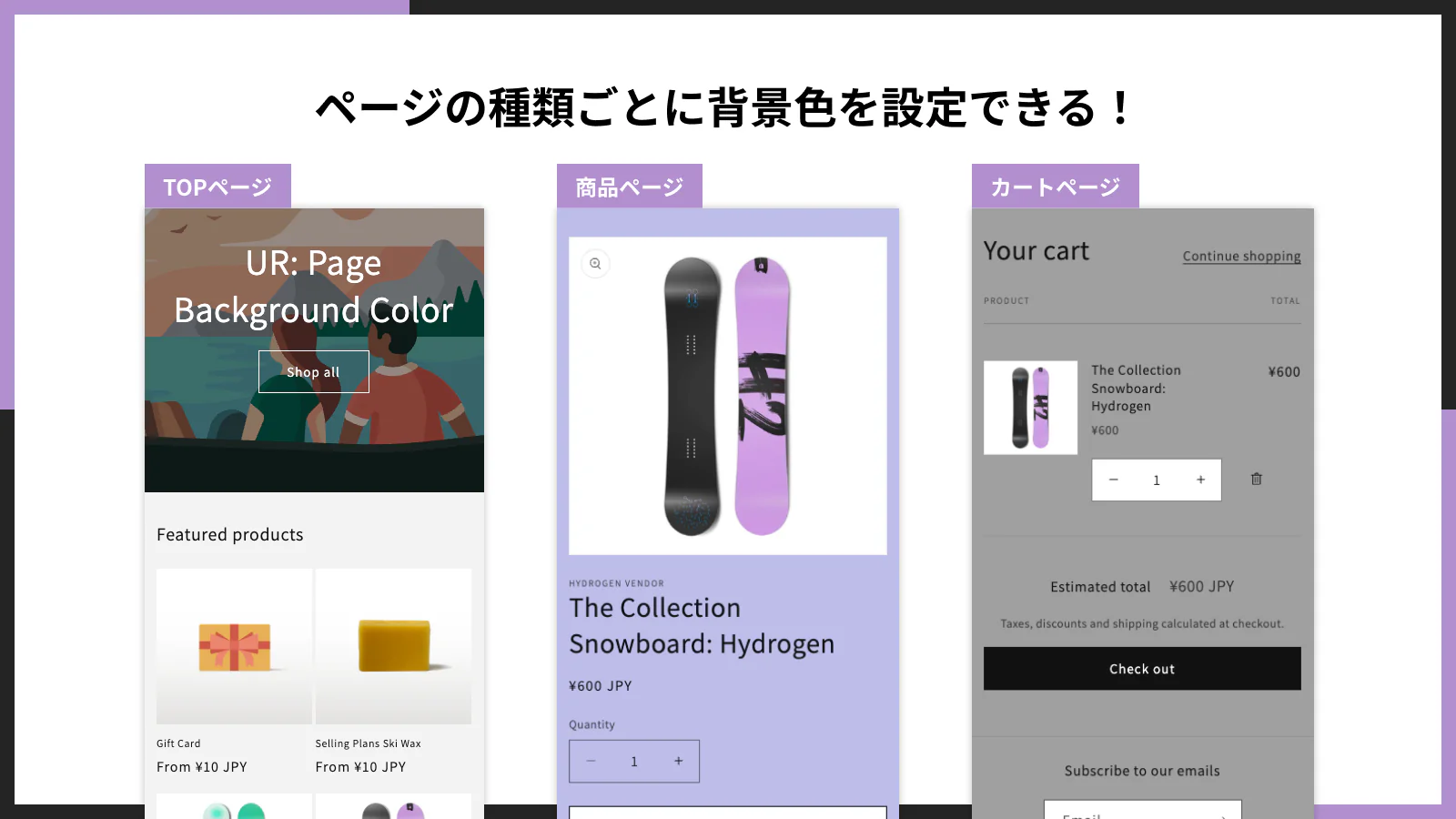 「商品ページは薄いブルー」「ブログページは淡いベージュ」など、ページタイプにあわせた色分けができます。特定の固定ページやコレクションページだけ別の色にするなど、カスタマイズ自由度が高いです。 -