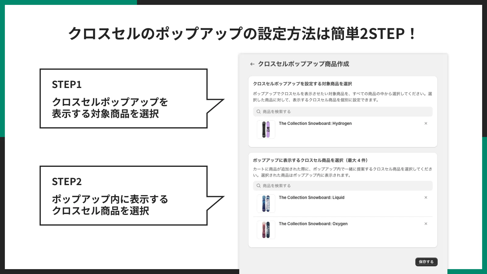 クロスセルのポップアップの設定方法は、2STEPで設定できます。