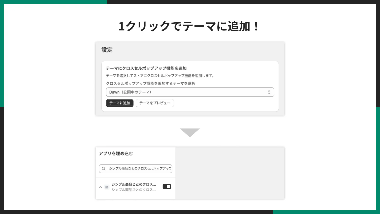 - Shopify アプリストア から「シンプル商品ごとのポップアップクロスセルアプリ」をインストール
