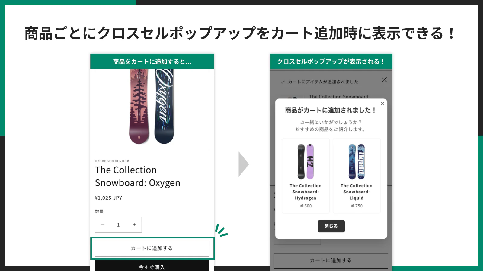 - 商品がカートに追加された際に、商品ごと に別々のクロスセルポップアップを表示