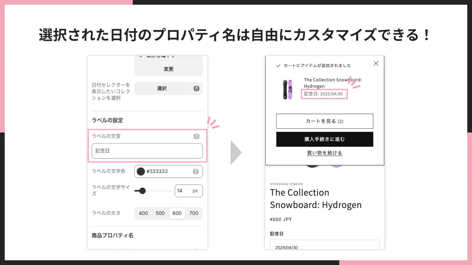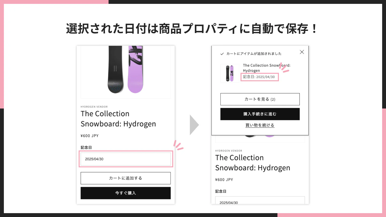 選択された日付は商品プロパティに自動で保存されます。記念日や希望日等の設定が可能です。