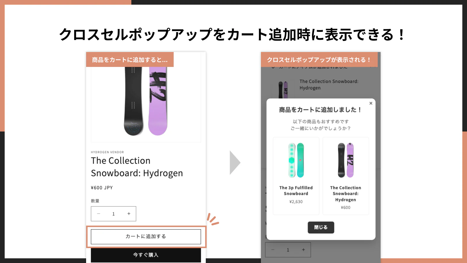 カート追加時に表示されるクロスセルポップアップを簡単に表示できます。
