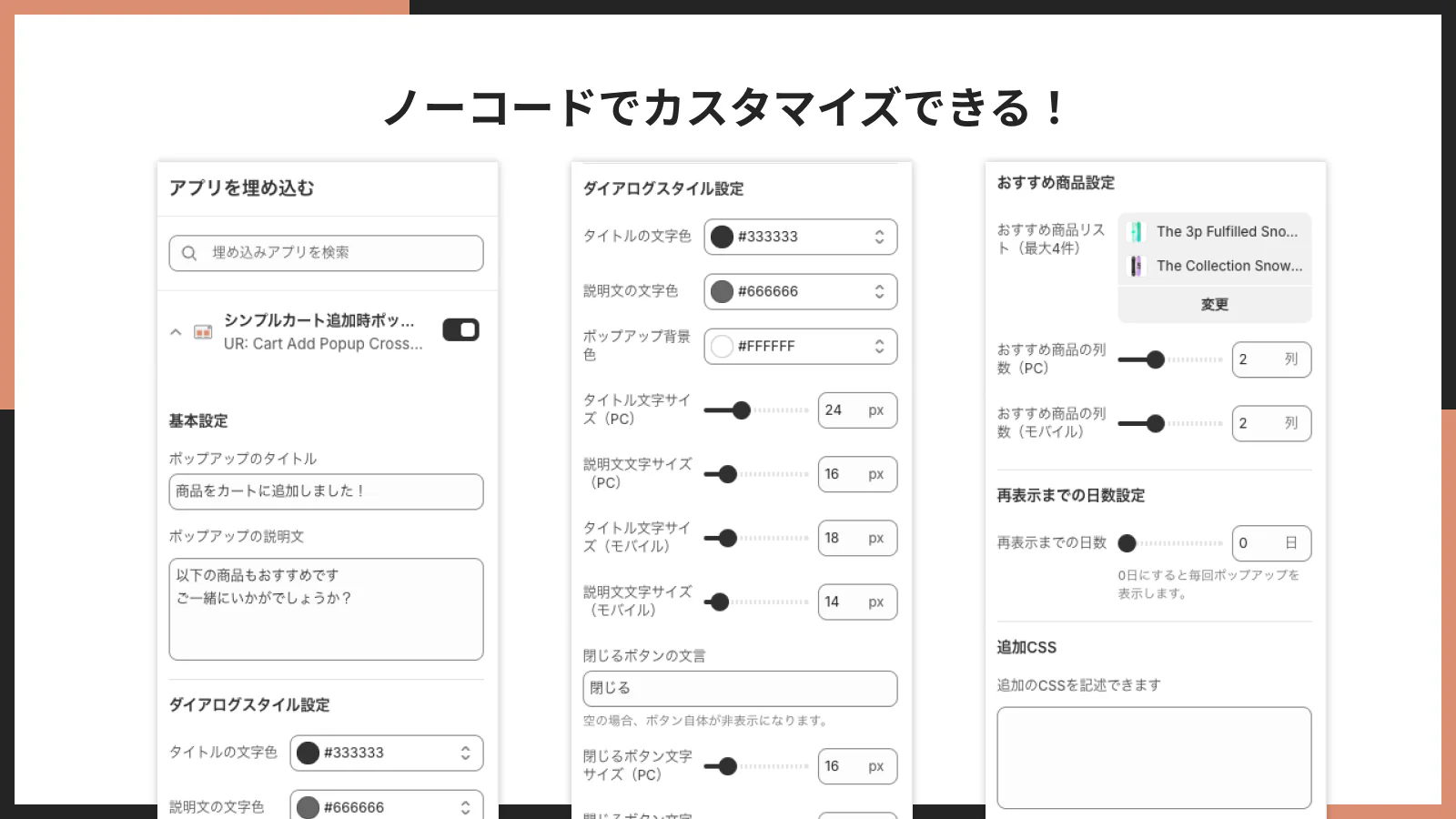 コーディング不要で、カート追加時のポップアップを表示する設定が可能です。アプリの管理画面からタイトルやメッセージ、表示する商品の選択などを直感的に行えます。 -