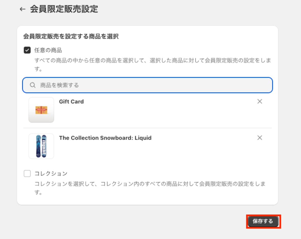 こちらで、ログイン必須販売する商品を選択して、保存しましょう。