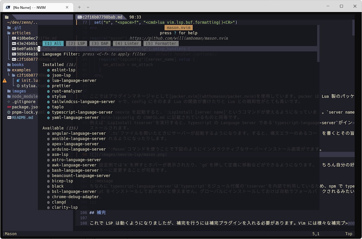 次に mason.nvim ですが、これは様々な外部依存パッケージを neovim 内からインストールできるようにするプラグインです。そして mason-lspconfig は mason.nvim でインストールした LSP サーバーを使うために必要です。