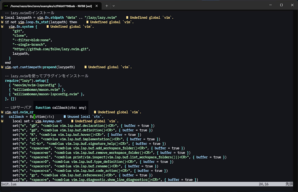 完了後、一旦Neovimを再起動してinit.luaを開くと自動で言語サーバが起動するはずです。LSPによる診断が表示され、上でも説明したようにKでホバーを出すこともできます。