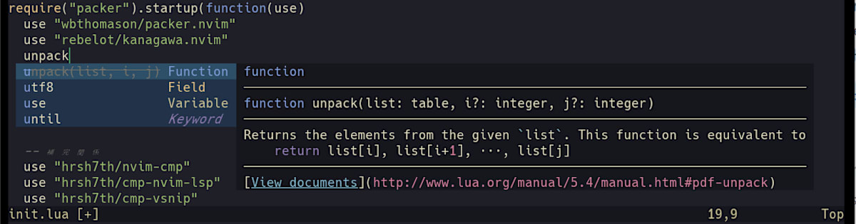 これで LSP は動くようになりましたが、補完を行うには補完プラグインを入れる必要があります。Vim には様々な補完プラグインがありますが、LSP への対応度が高いnvim-cmpがおすすめです。この記事ではこれを使用します。