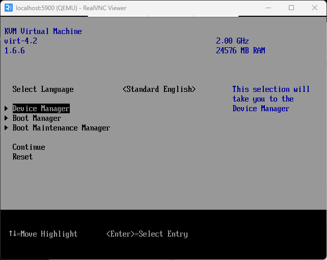 お好きなVNCビューアを使ってlocalhost:5900に接続します。するとこのようにブートメニューが出るはずです。