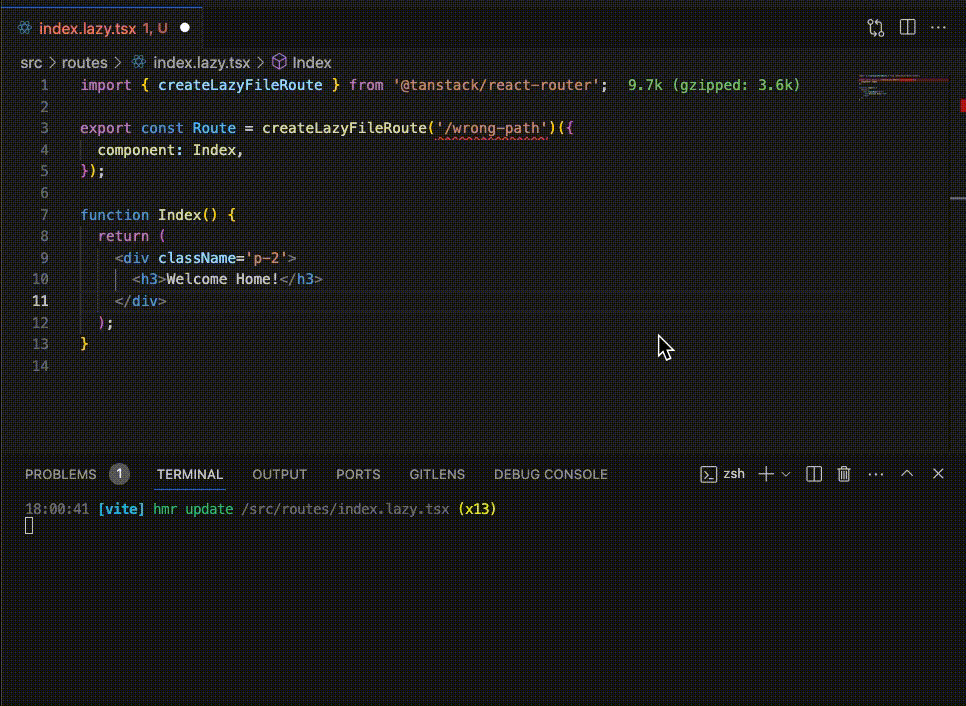 With the plugin enabled, Vite will now watch your configured routesDirectory and generate your route tree whenever a file is added, removed, or changed.