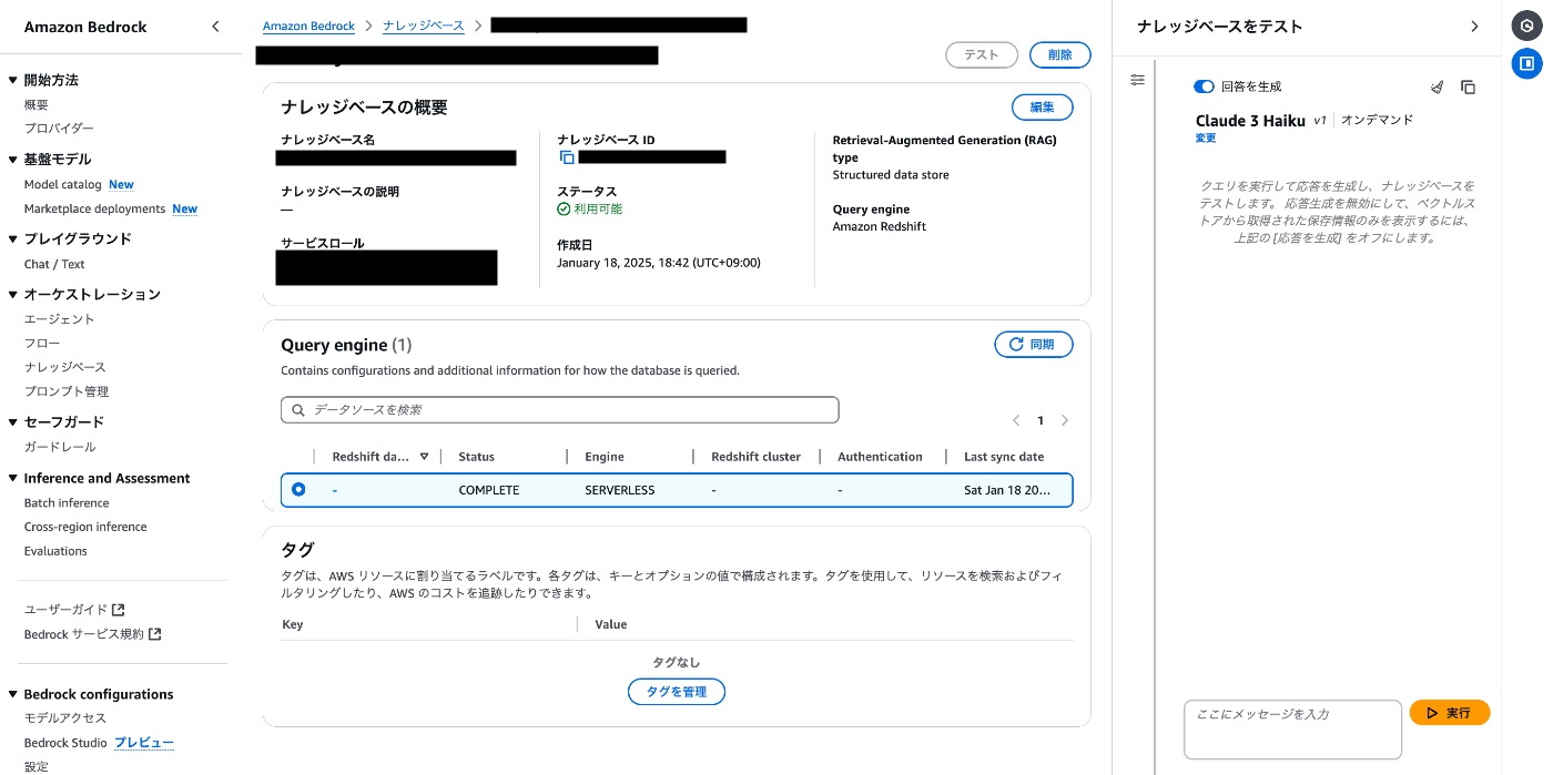 - Amazon Bedrock>ナレッジベース>作成されたナレッジベース名