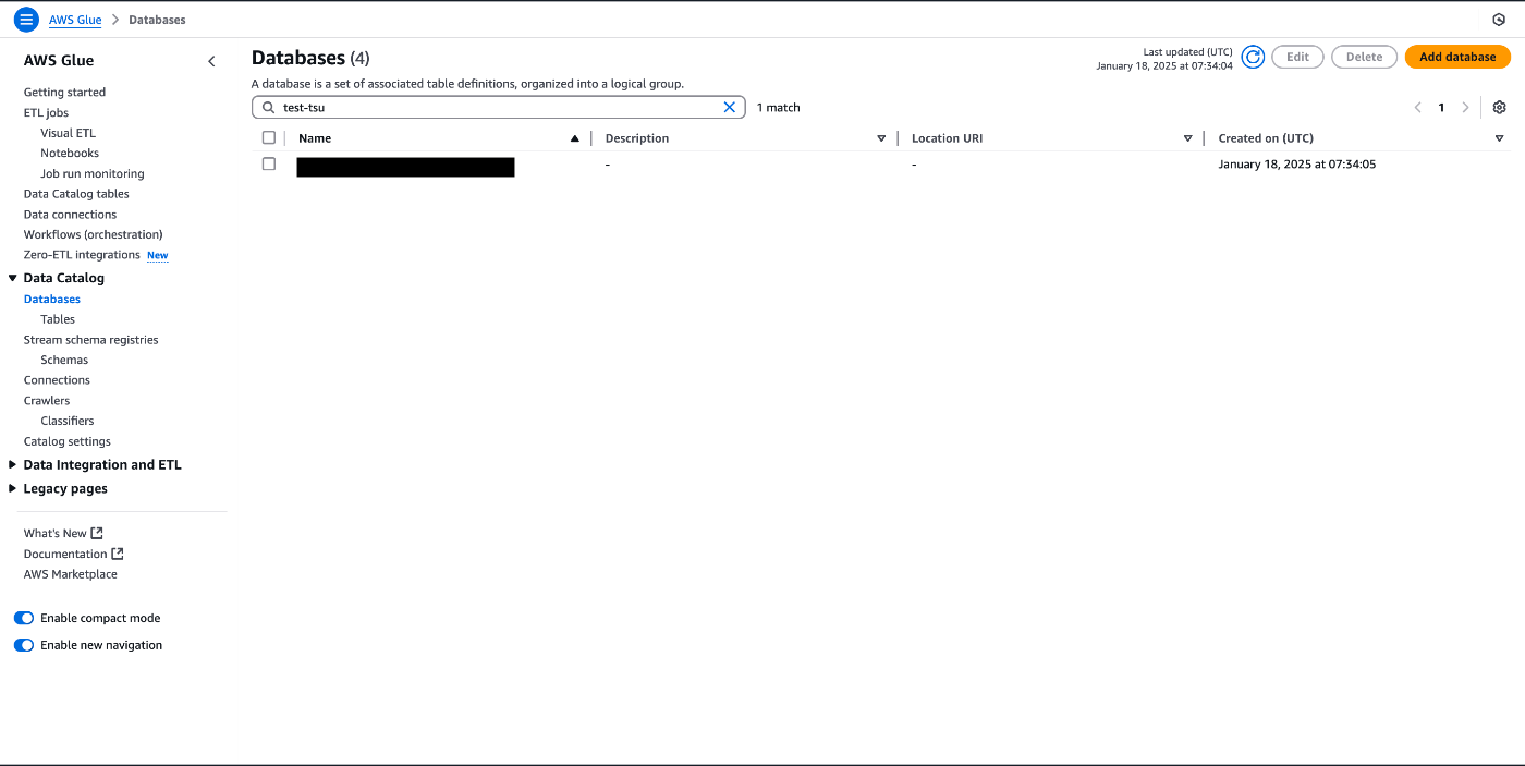 - AWS Glue>Data Catalog>Databases>Add database