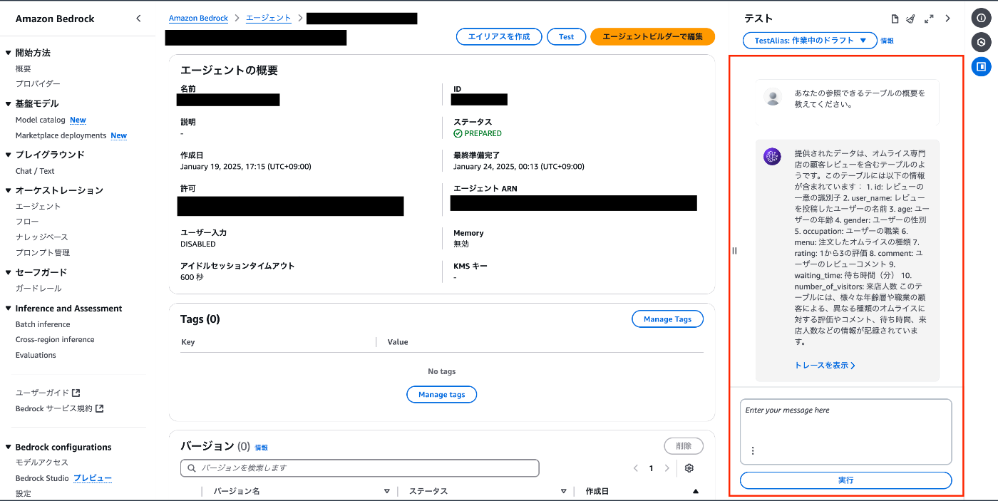 - Amazon Bedrock>エージェント>エージェントを作成