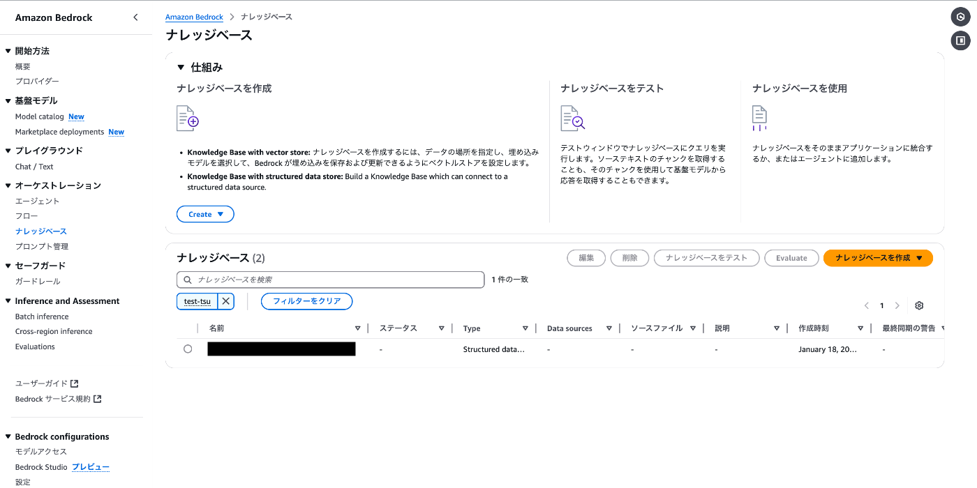 - Amazon Bedrock>ナレッジベース>ナレッジベースを作成>Knowledge Base with structured data source