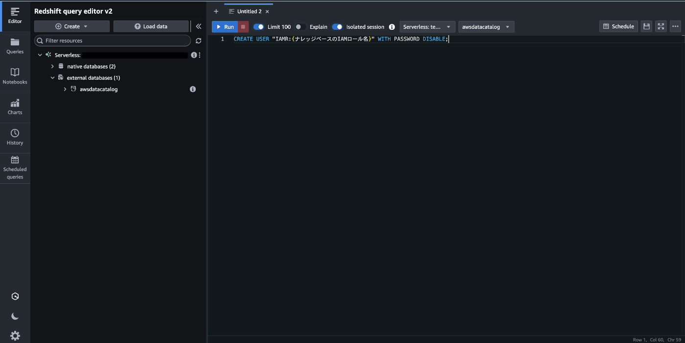 # ナレッジベースのIAMロールを介して認証できるデータベースユーザー作成する $ CREATE USER "IAMR:{ナレッジベースのIAMロール名}" WITH PASSWORD DISABLE;