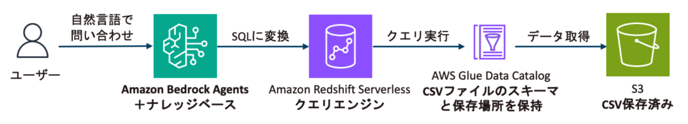 以下の構成図でAmazon Bedrock ナレッジベースのText-to-SQLを試してみました。手順書に近い記事になってしまいましたが、要所でスクショを貼っていますので、実際に操作しなくても設定の雰囲気は掴めるのではないかと思います。操作に詰まった方の助けにもなれれば幸いです。