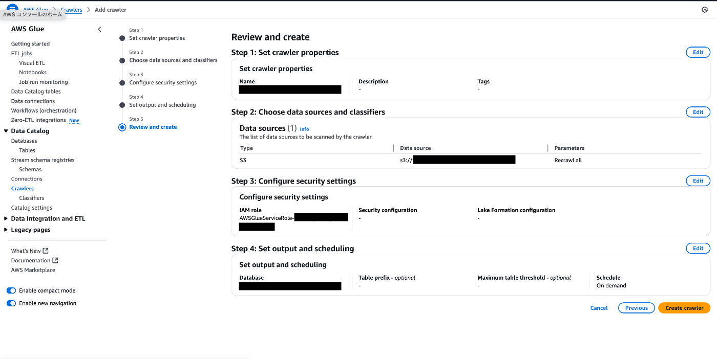- 内容を確認して、Create crawler を押下する。