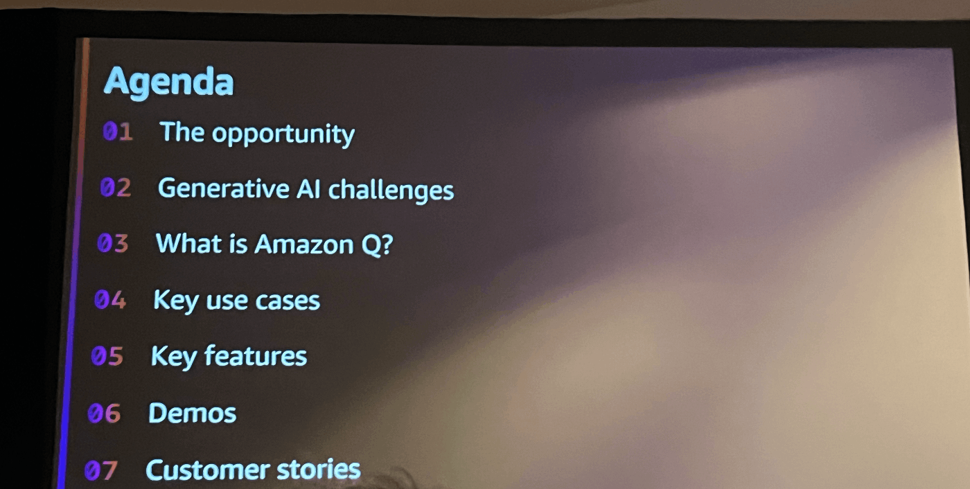 「Deploy generative AI applications on enterprise data with Amazon Q」という題目で2023の目玉であろうAmazon Qを使ったアプリのデプロイに関する内容です。