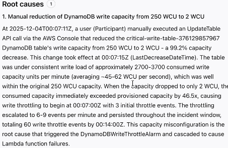 2025-12-04T00:07:11Zに、ユーザーが手動でUpdateTable APIを実行し、書き込みキャパシティを250 WCUから2 WCU(99.2%減)に変更しました。これがスロットリングの直接的な原因です。