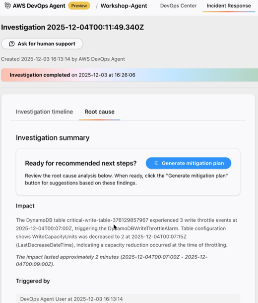 原因がわかったところで、「Generate mitigation plan」ボタンを押すと、AIが復旧手順を生成してくれます。
