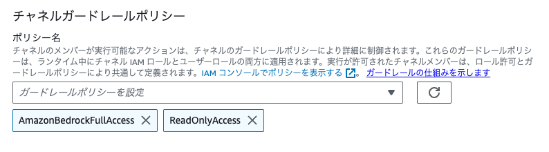 基本的に画面に従って設定すればOKですが、チャネルガードレールポリシーにbedrock:InvokeAgent