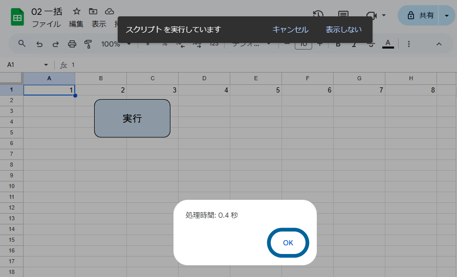 Browser.msgBox("処理時間: " + elapsedTime/1000 + " 秒");