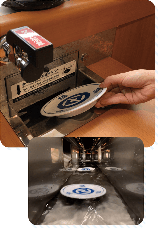 因みに、この投入口から入った皿は下で流れている水のレーンを辿って洗い場まで流れるような仕組みになっています。この技術によって皿のカウントが出来ると同時に、今まで会計後に運んでいたスタッフの労働を減らすことが出来ました。